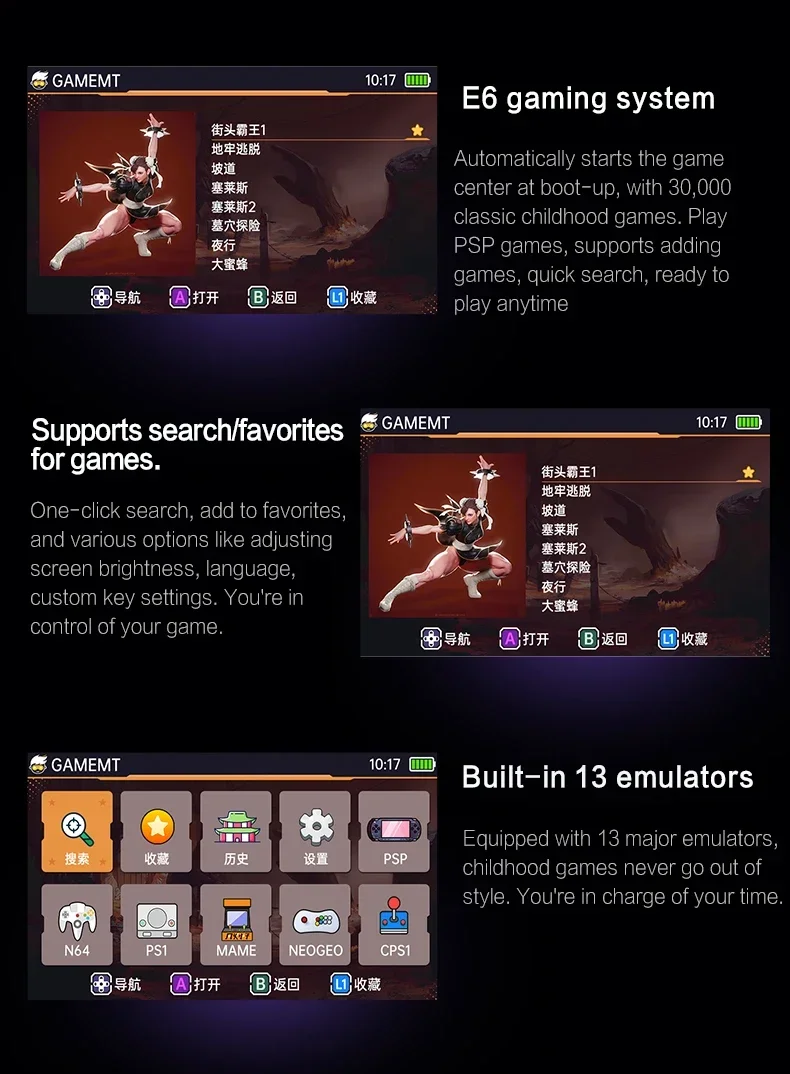 جهاز الألعاب المحمول E6 Plus بمعالج Rk3566 ونظام مزدوج، بشاشة عالية الدقة تعمل باللمس بحجم 5.0 بوصة ودعم العرض عبر الواي فاي